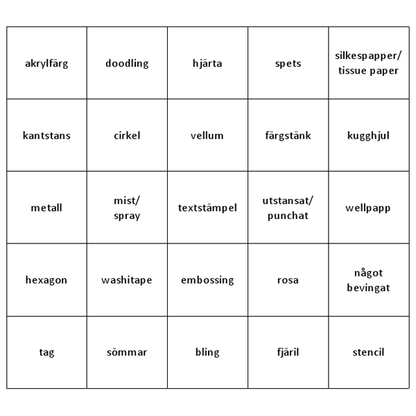 En timme en utmaning är en ny rolig utmaning på Svensk Scrapbooking som dyker upp lite då och då. Man har alltså en timme på sig att skapa något (utifrån vissa kriterier), fota det och mejla in. De sista två stege tar för mig oftast tio miuter bara det, så det kan bli stressigt. Men det är kul! Denna gång fick jag en idé direkt och det ni ser ovan blev resultatet. Man skulle utgå från en bingobricka och välja en rad. Jag valde den sista: tag, sömmar, bling, fjäril och stencil.